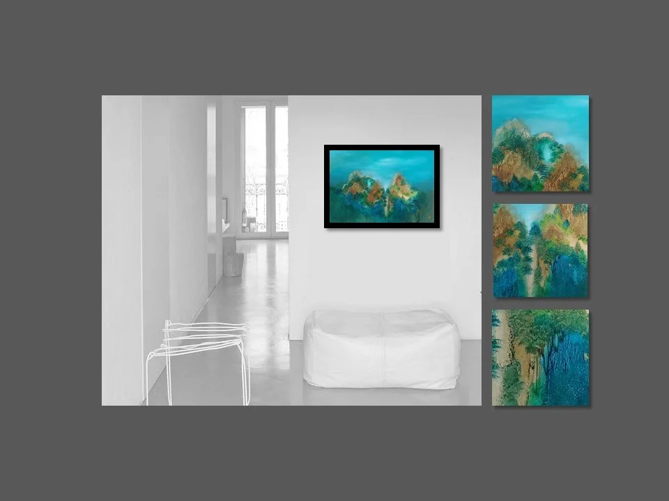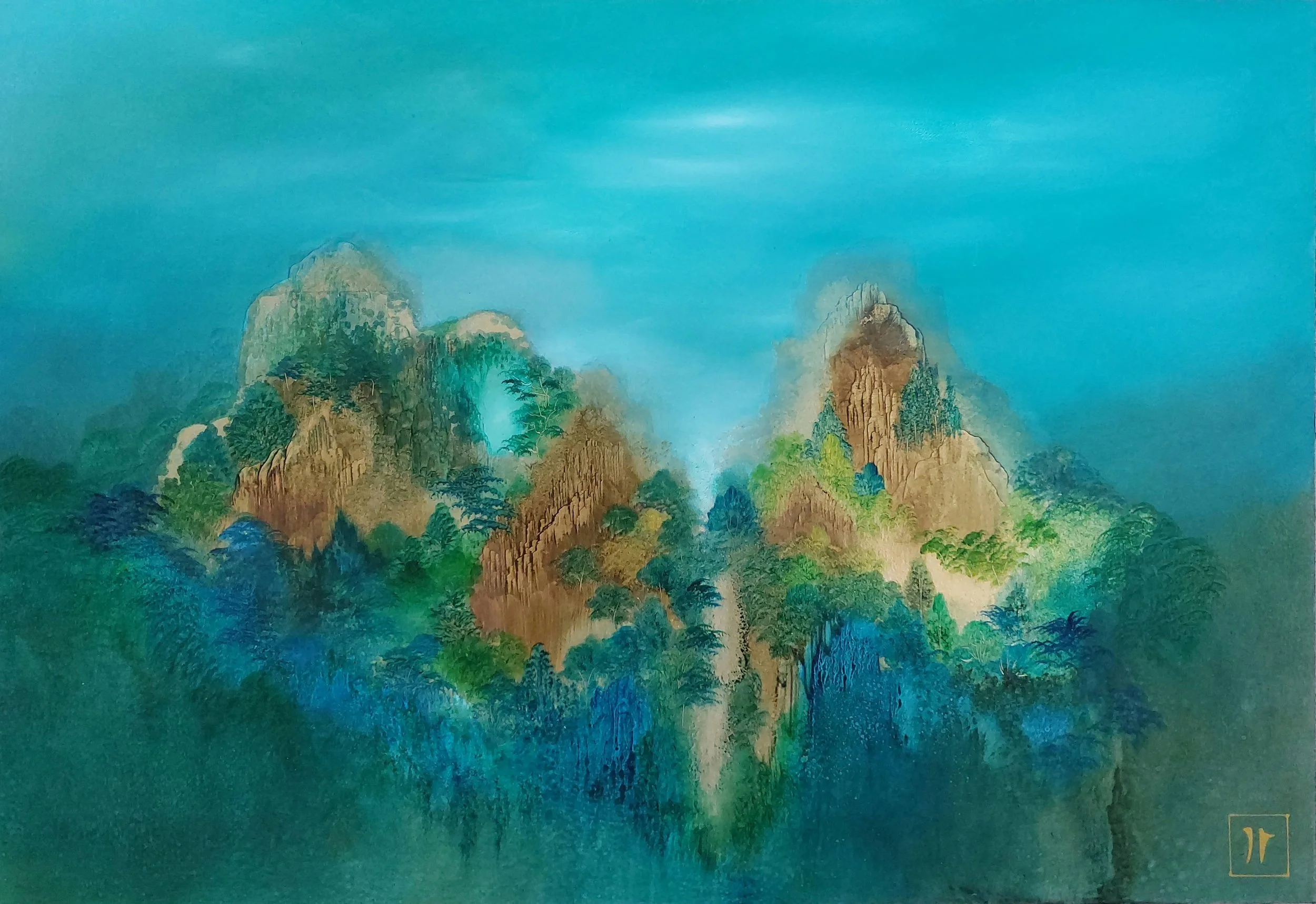 "Des sommets dorés émergent de la brume turquoise, suspendus entre ciel et terre. Un monde flottant où le temps s’efface, invitant le regard à s’évader vers des contrées mystiques inaccessibles."