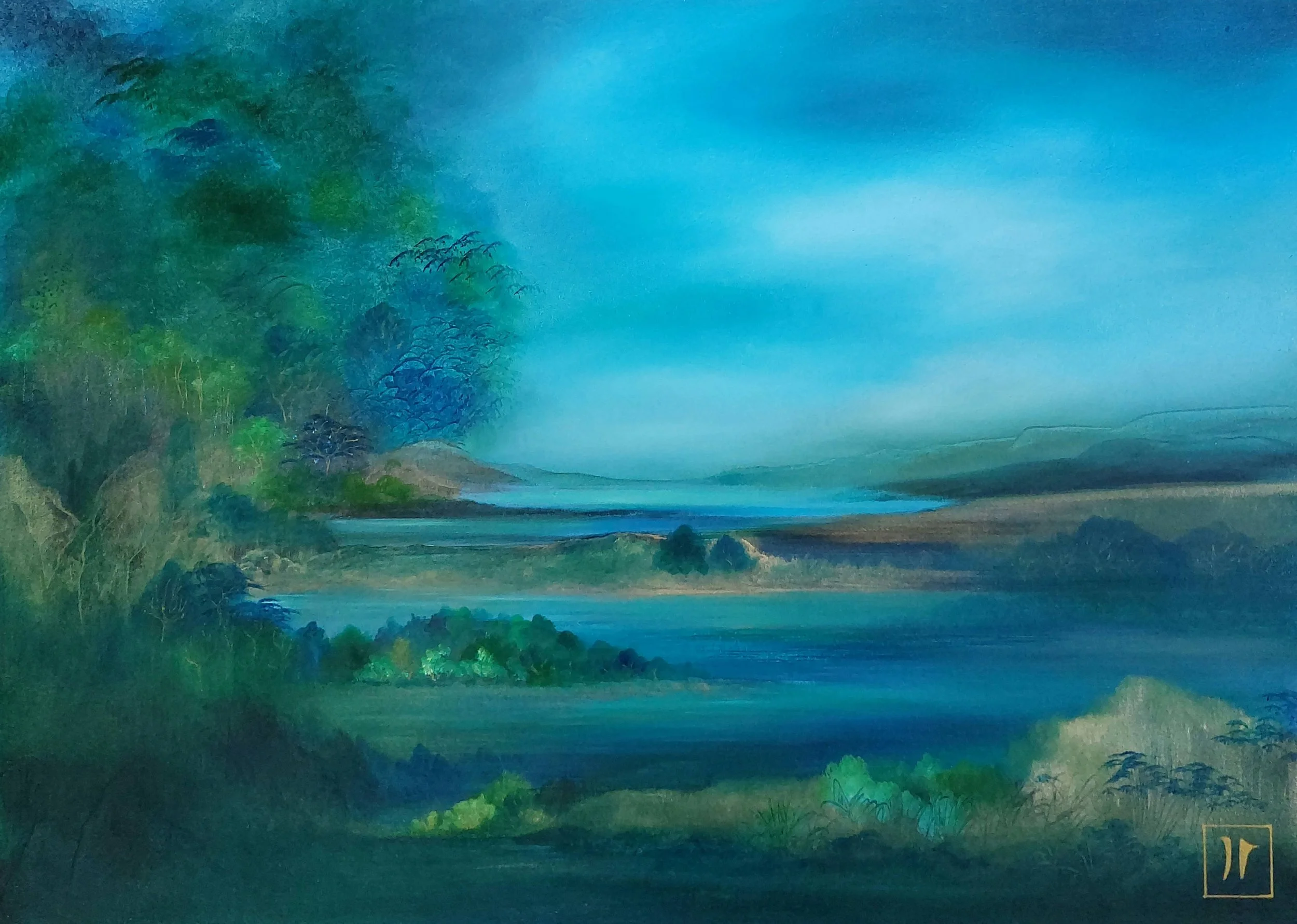 "Entre eau et brume, le paysage se dissout dans une atmosphère feutrée. Les formes émergent puis s’effacent, laissant place à une sensation de calme profond. Cette lagune imaginaire devient un lieu de retrait, un espace intime où l’esprit peut dériver librement."